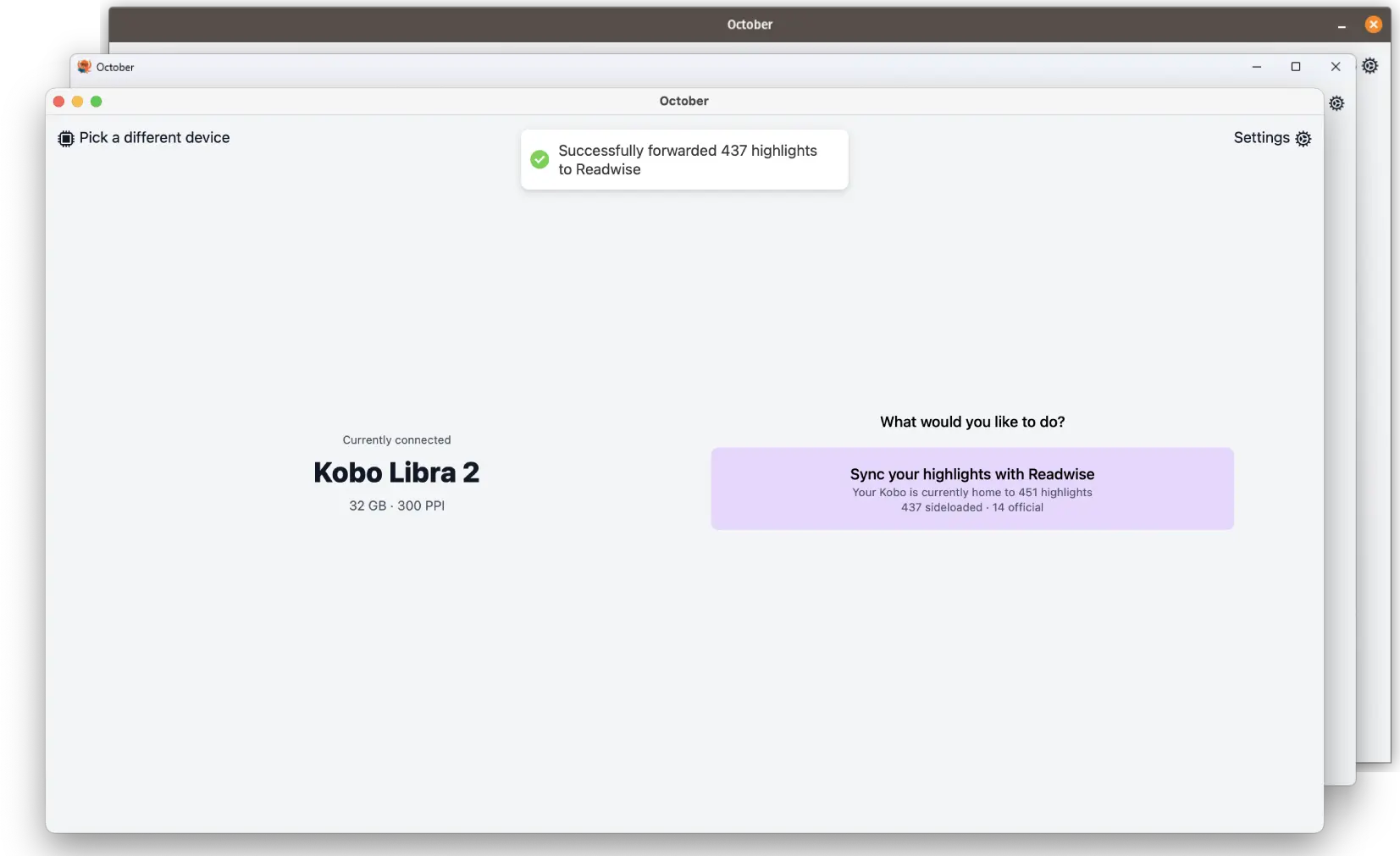 October is a small Wails application that makes it really easy to extract highlights from Kobo eReaders and then forward them to Readwise.